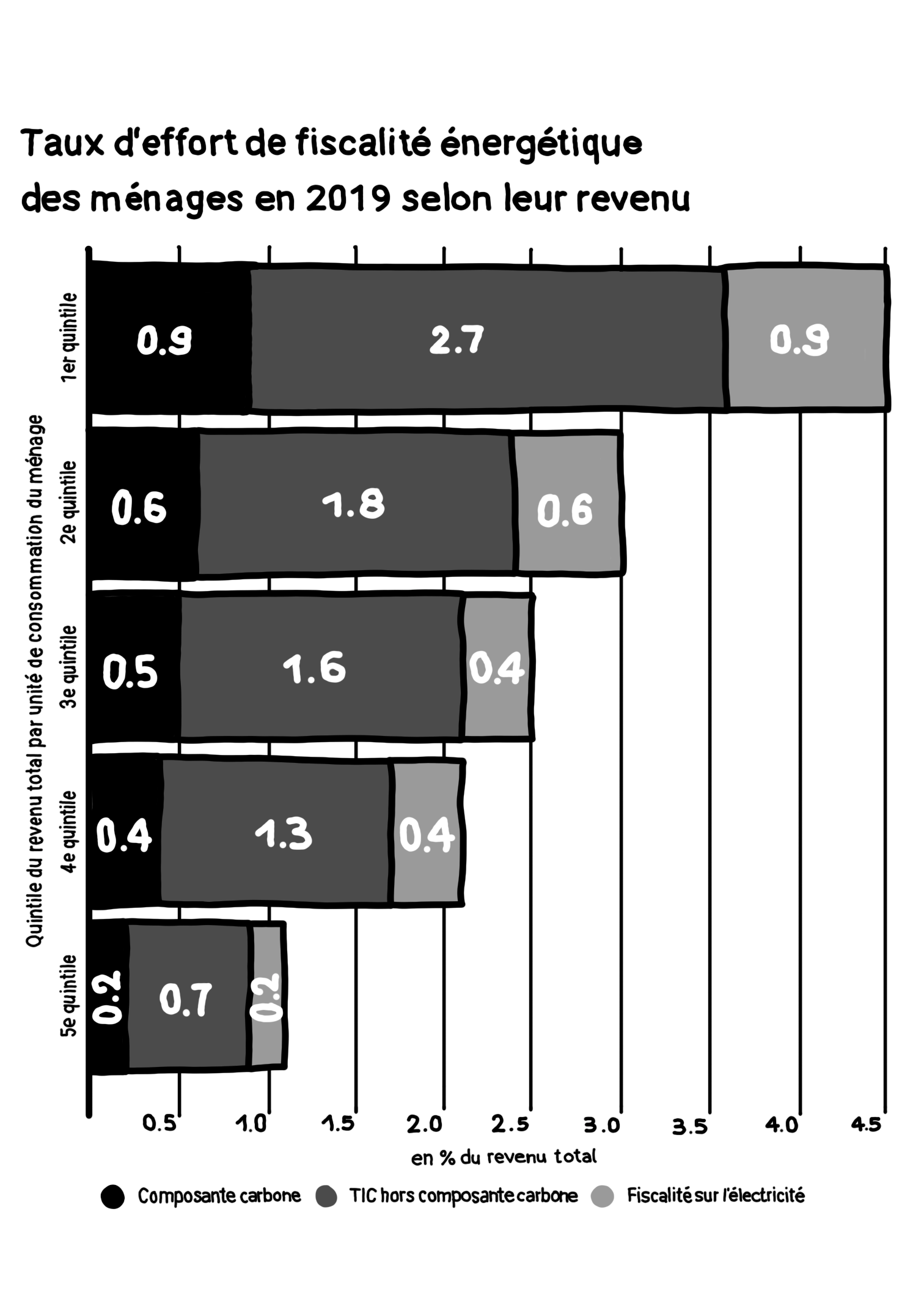 Ainsi, en 2019, les 20 % des ménages les plus modestes allouaient 4,5 % de leur revenu annuel à la fiscalité énergétique (TIGCN pour le gaz, TICFE pour l’électricité…) contre seulement 1,3 % en moyenne pour les 20 % des ménages les plus riches.